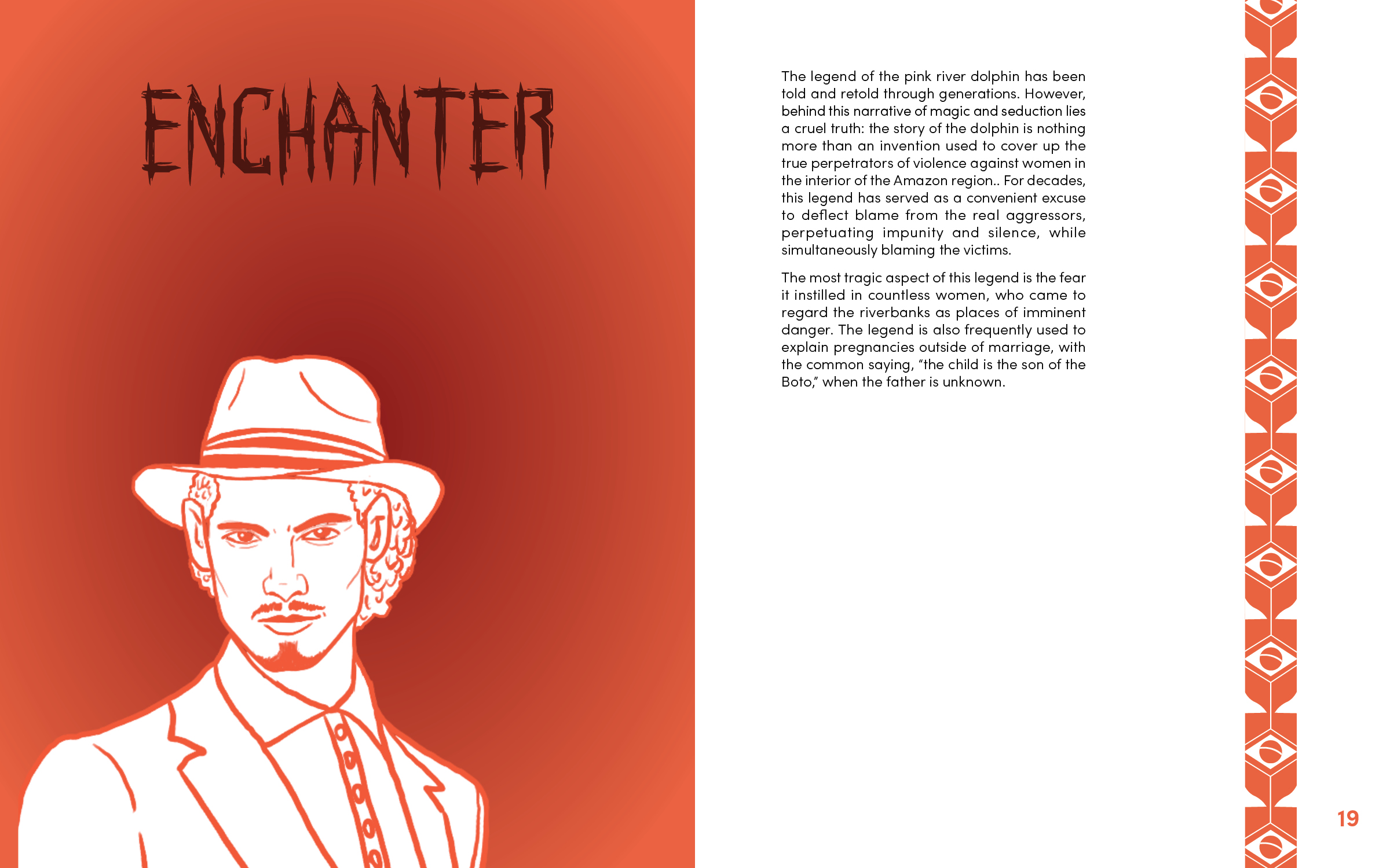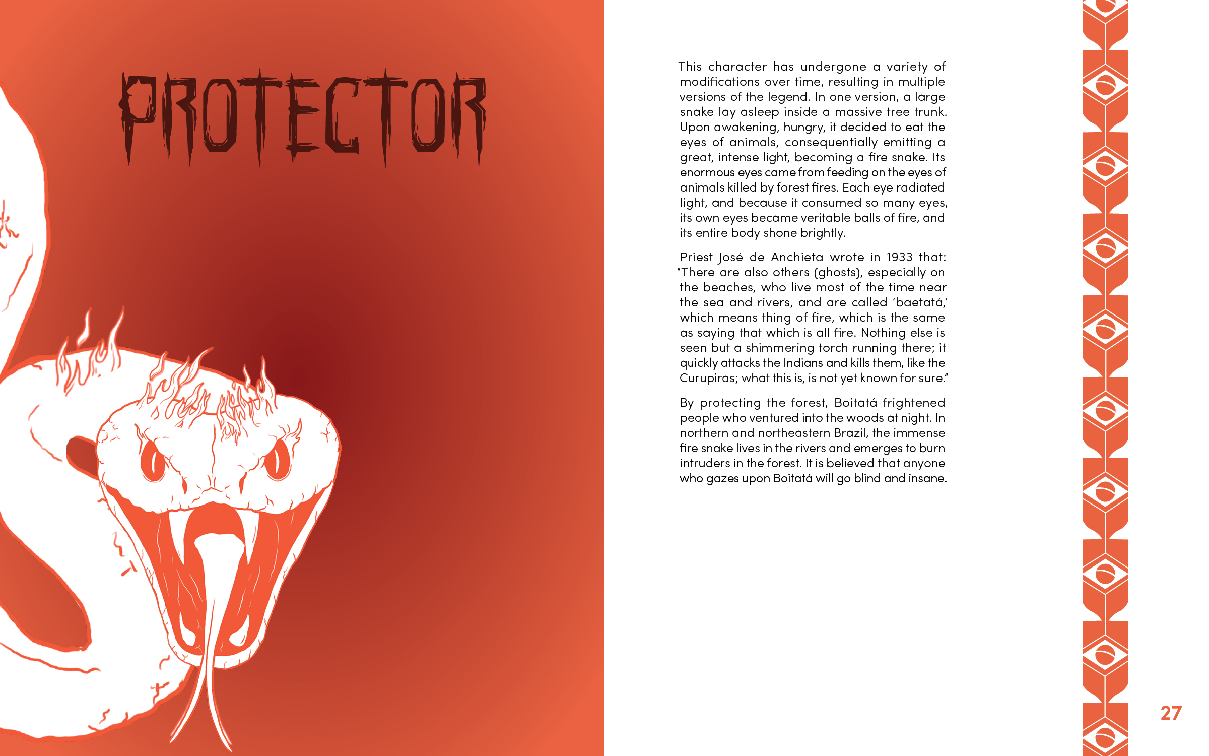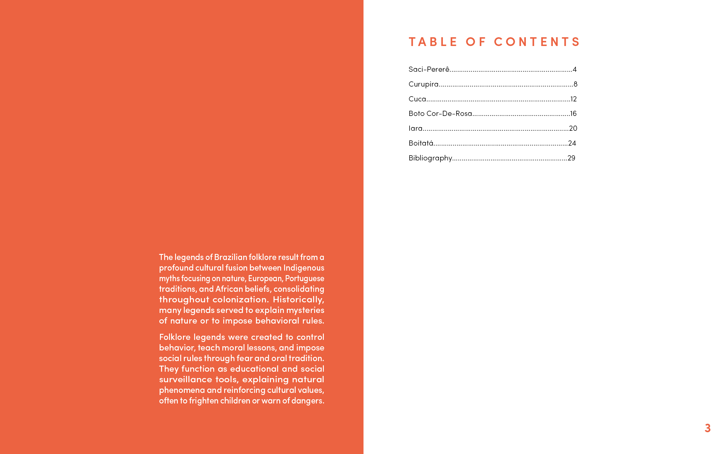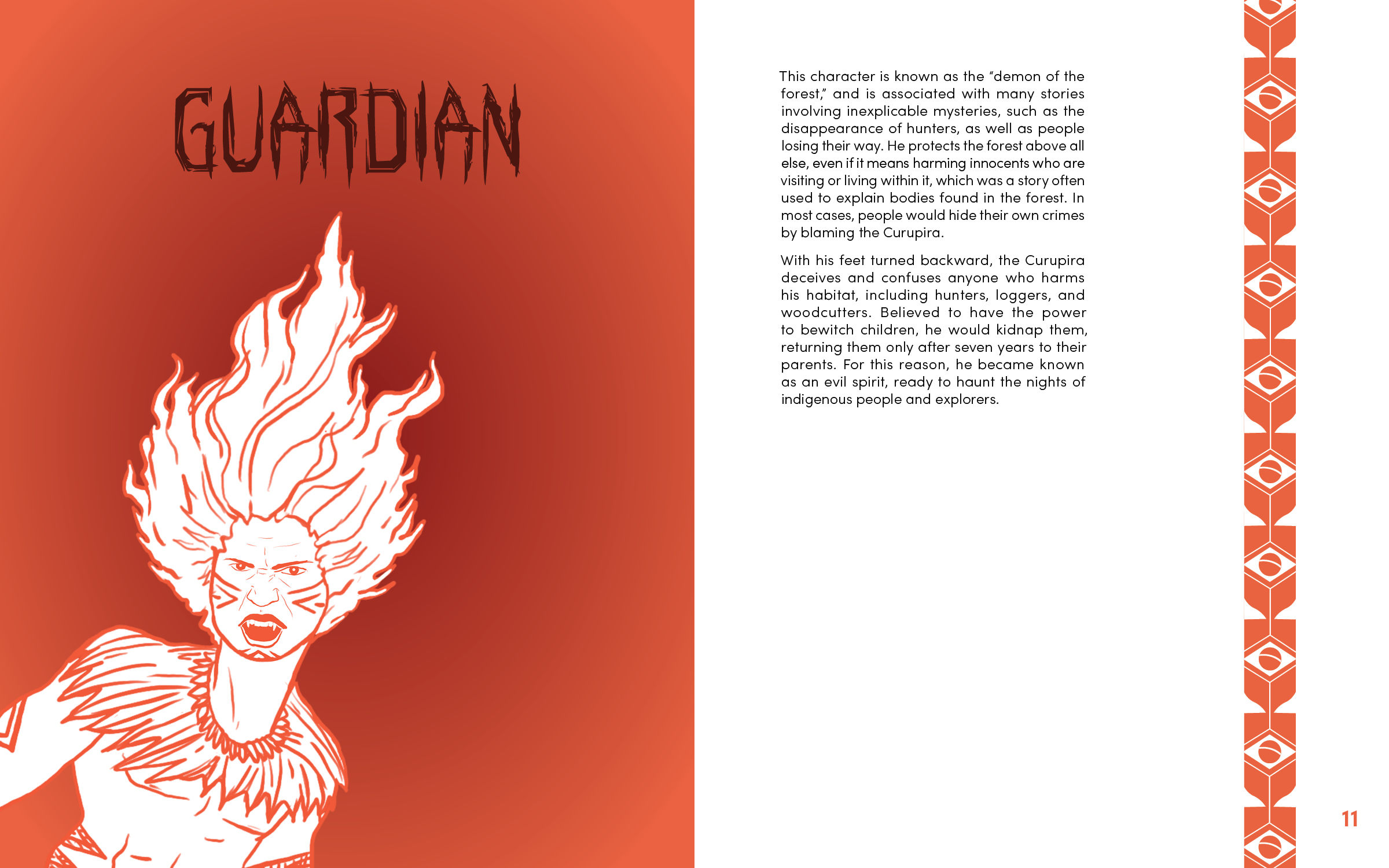 Rooted in a fusion of Indigenous, European, and African influences, the content reflects how these stories were historically used to explain the unknown and shape behavior, often through fear. Darker spreads are introduced throughout the book, using deeper tones of red to reflect the more unsettling realities behind these myths.