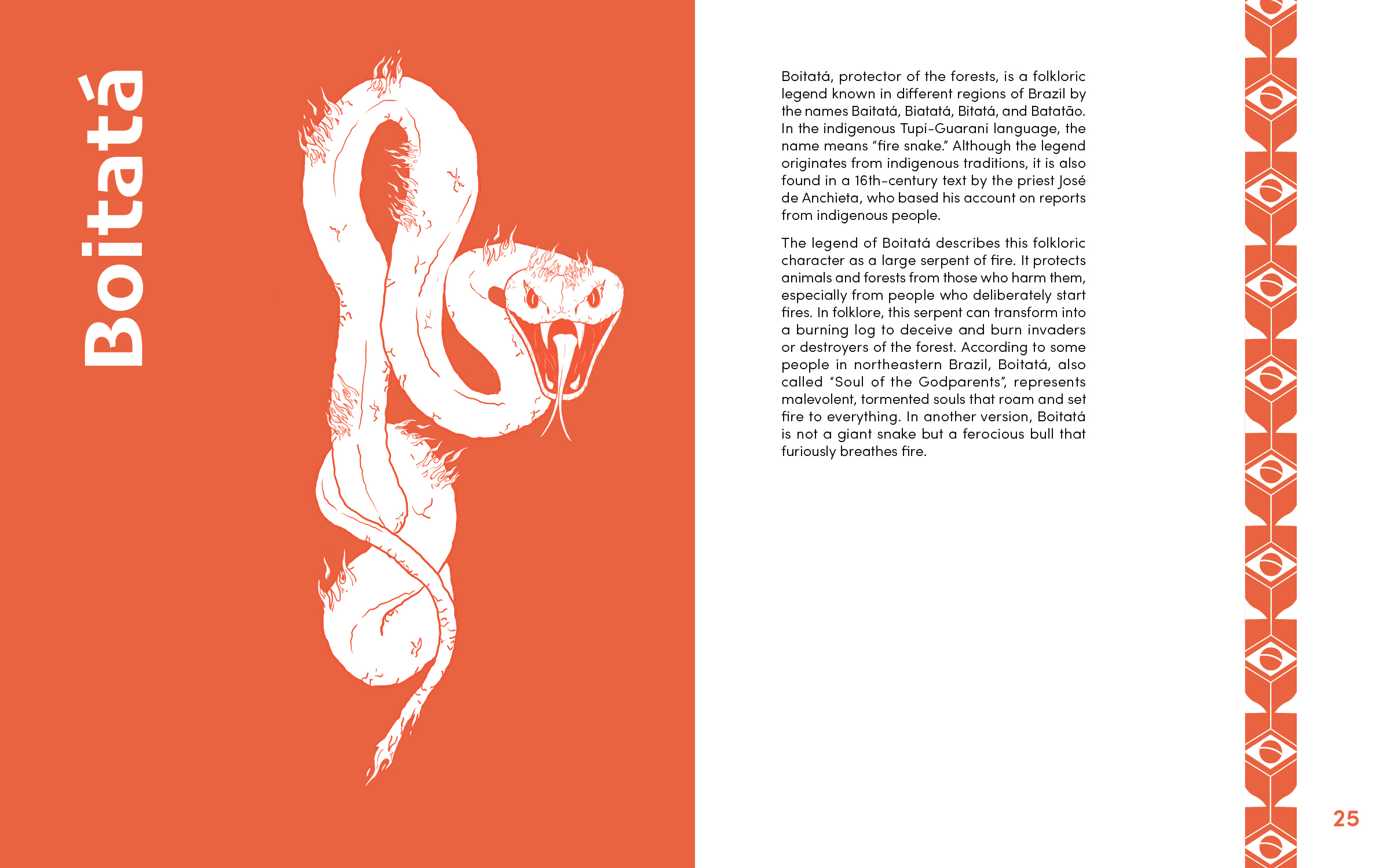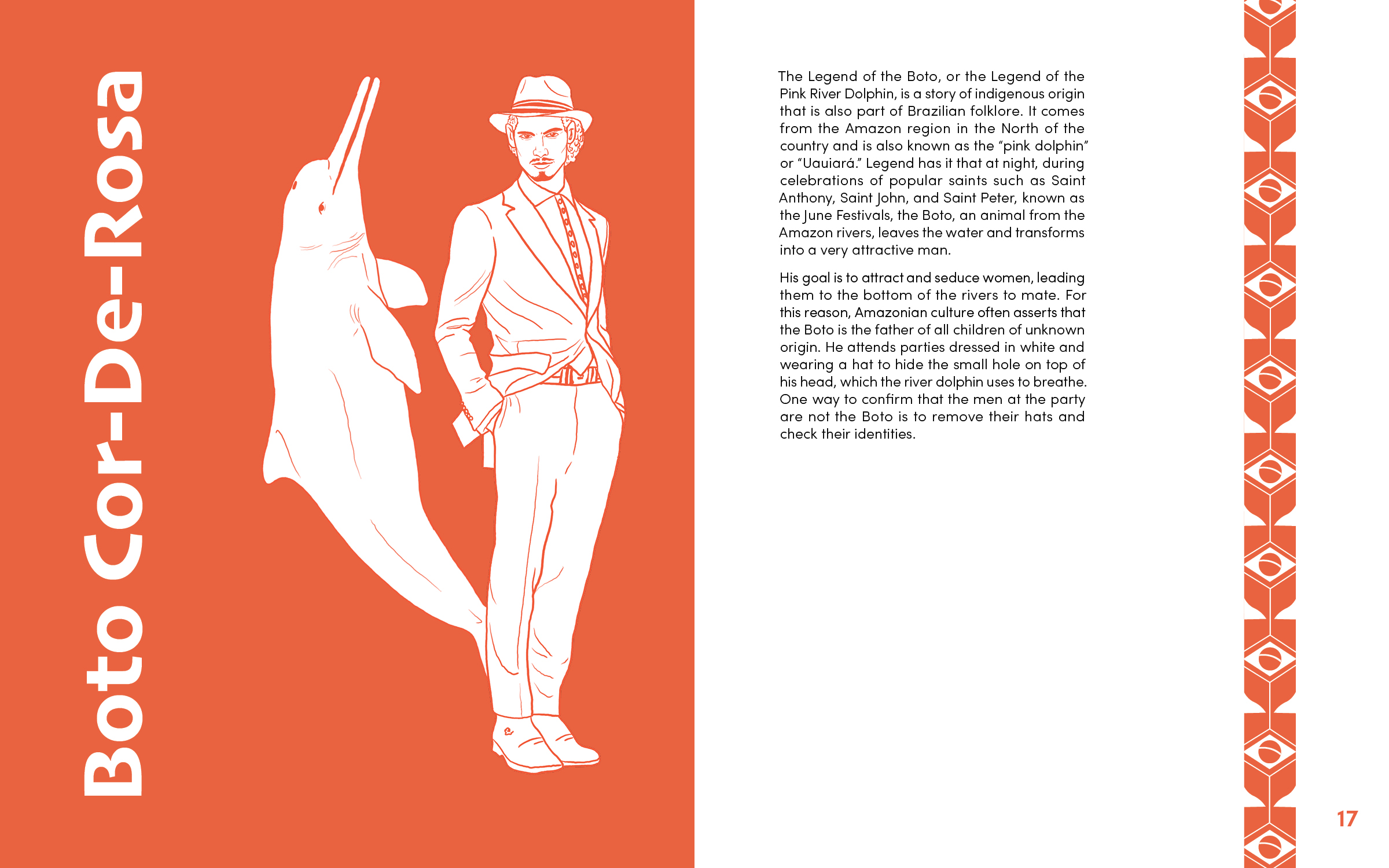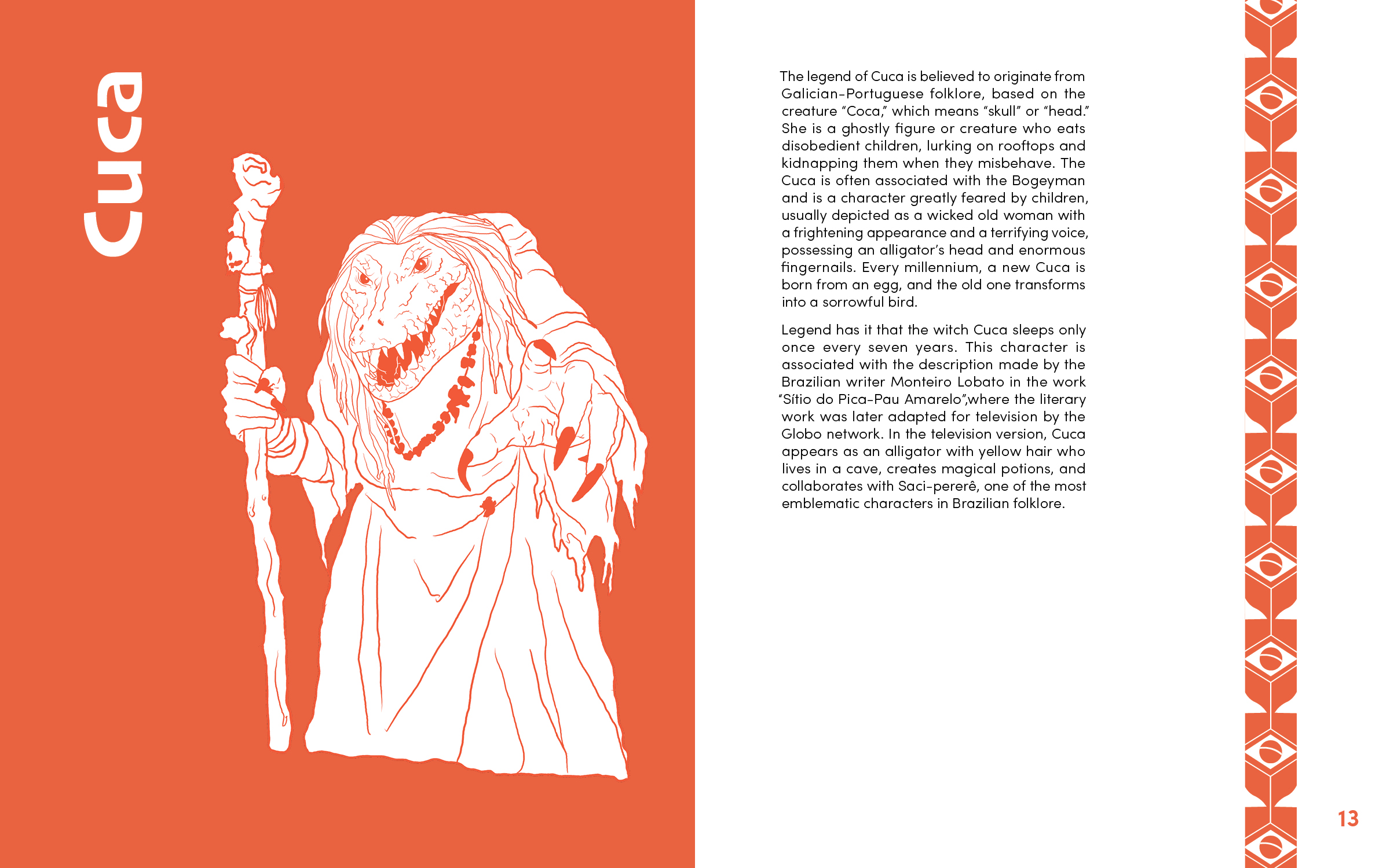 This book design explores Brazilian folklore through a bold and contemporary visual language, combining vivid color with hand-drawn illustrations. Centered around a striking orange palette, the project brings traditional myths into a modern editorial format.