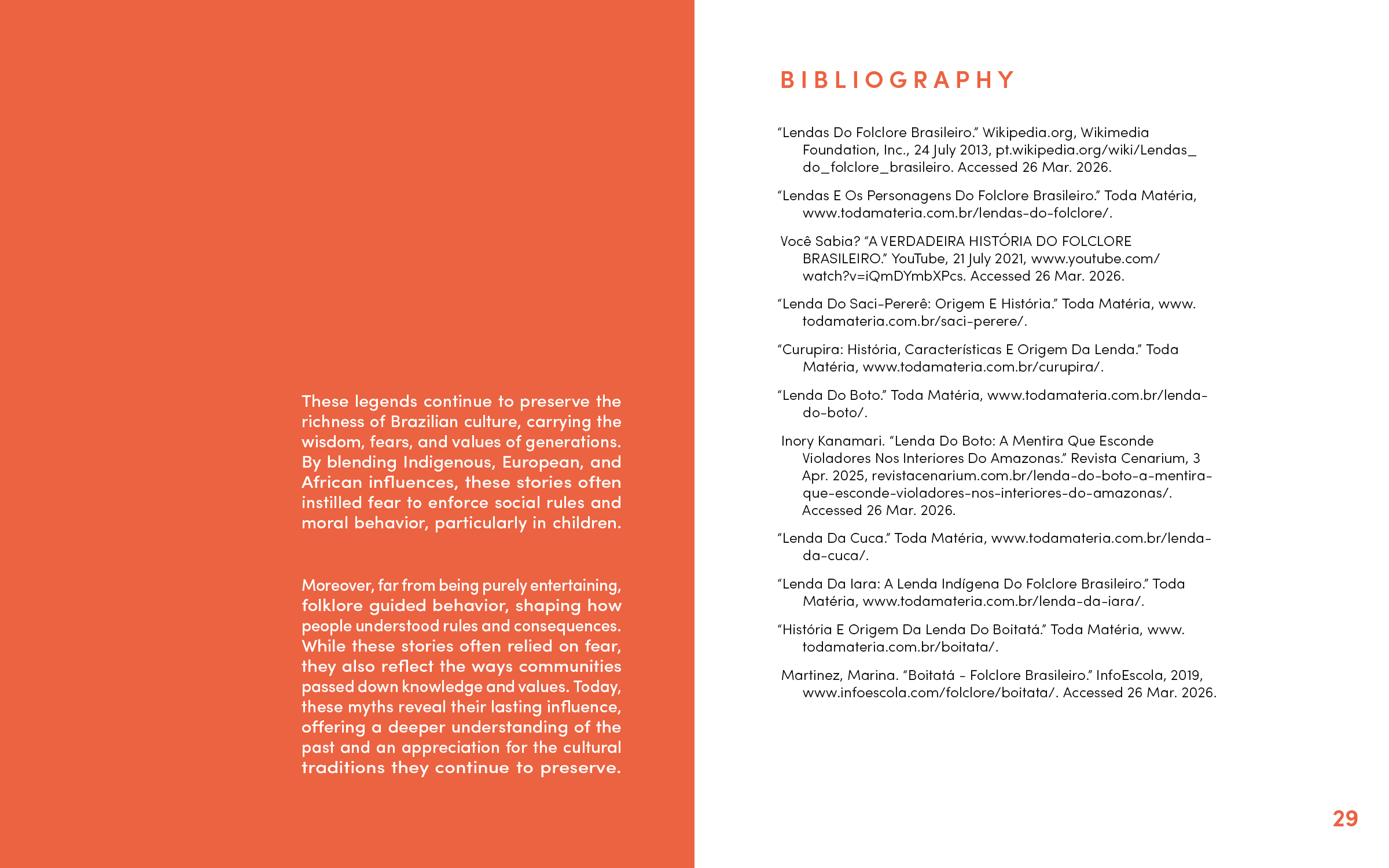 The objective of this project was to create a book inspired by South America, with a focus on Brazil, my birthplace. I chose to explore Brazilian folklore, drawing on the stories I grew up hearing. Tales that both fascinated and absolutely terrified me, like the ones where shadowy creatures lurk in the forest or mischievous spirits cause all sorts of chaos while you’re trying to sleep. Rather than writing the content myself, I gathered stories from online sources and brought them to life through bold, expressive illustrations. I also designed and edited the entire layout, transforming these eerie yet captivating tales into a visually striking book that shares my culture with readers.